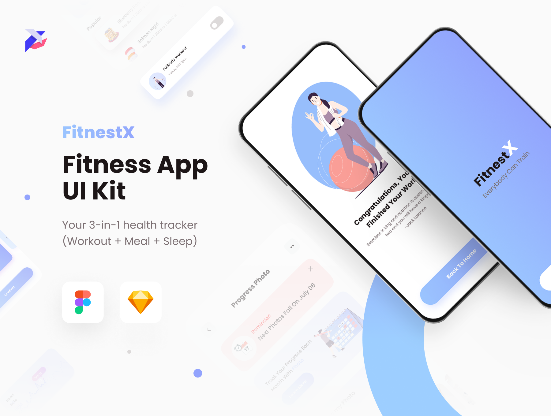 FitnestX is a Fitness App UI Kit thoughtfully created by Pixel True. It's your 3-in-1 fitness tracker. It helps you track your workout, meal, and sleep - making it easy to see your overall progress.