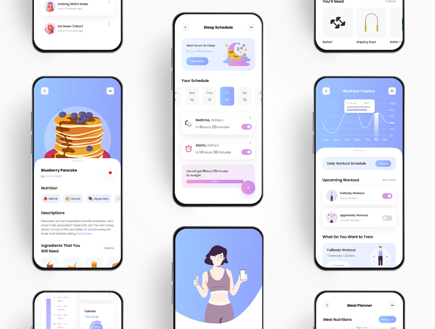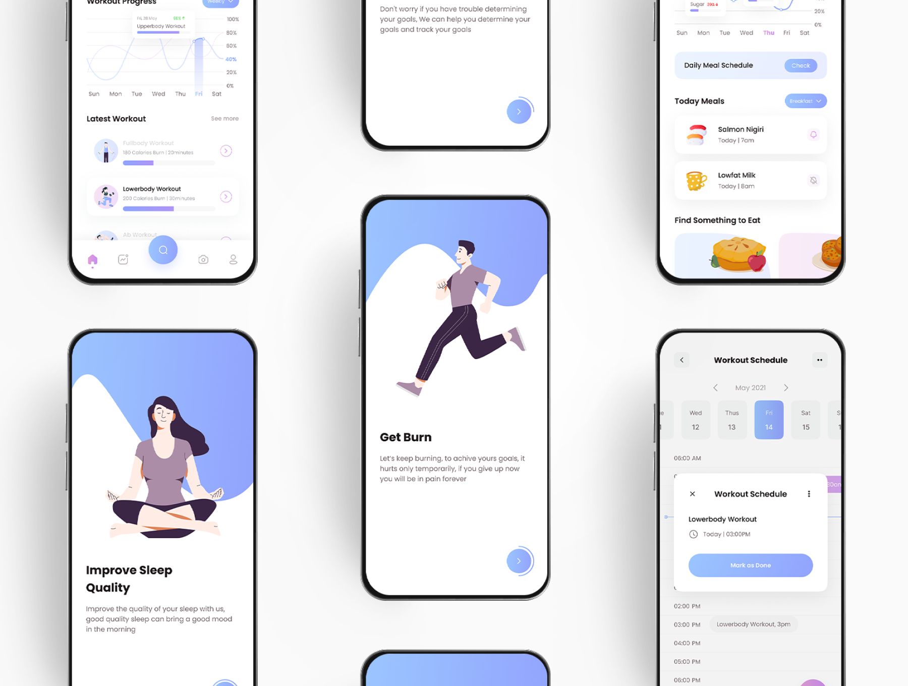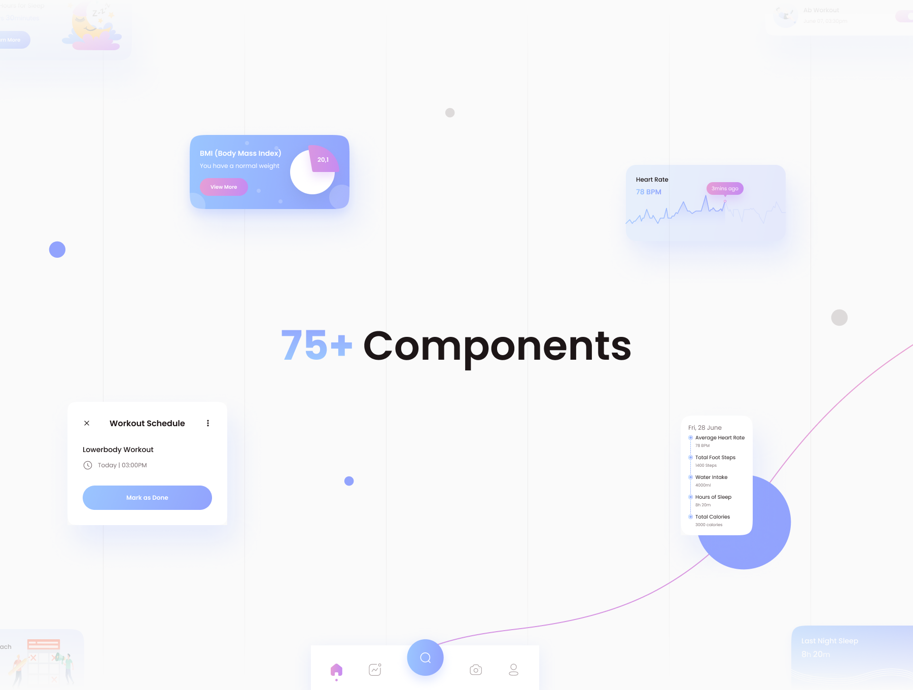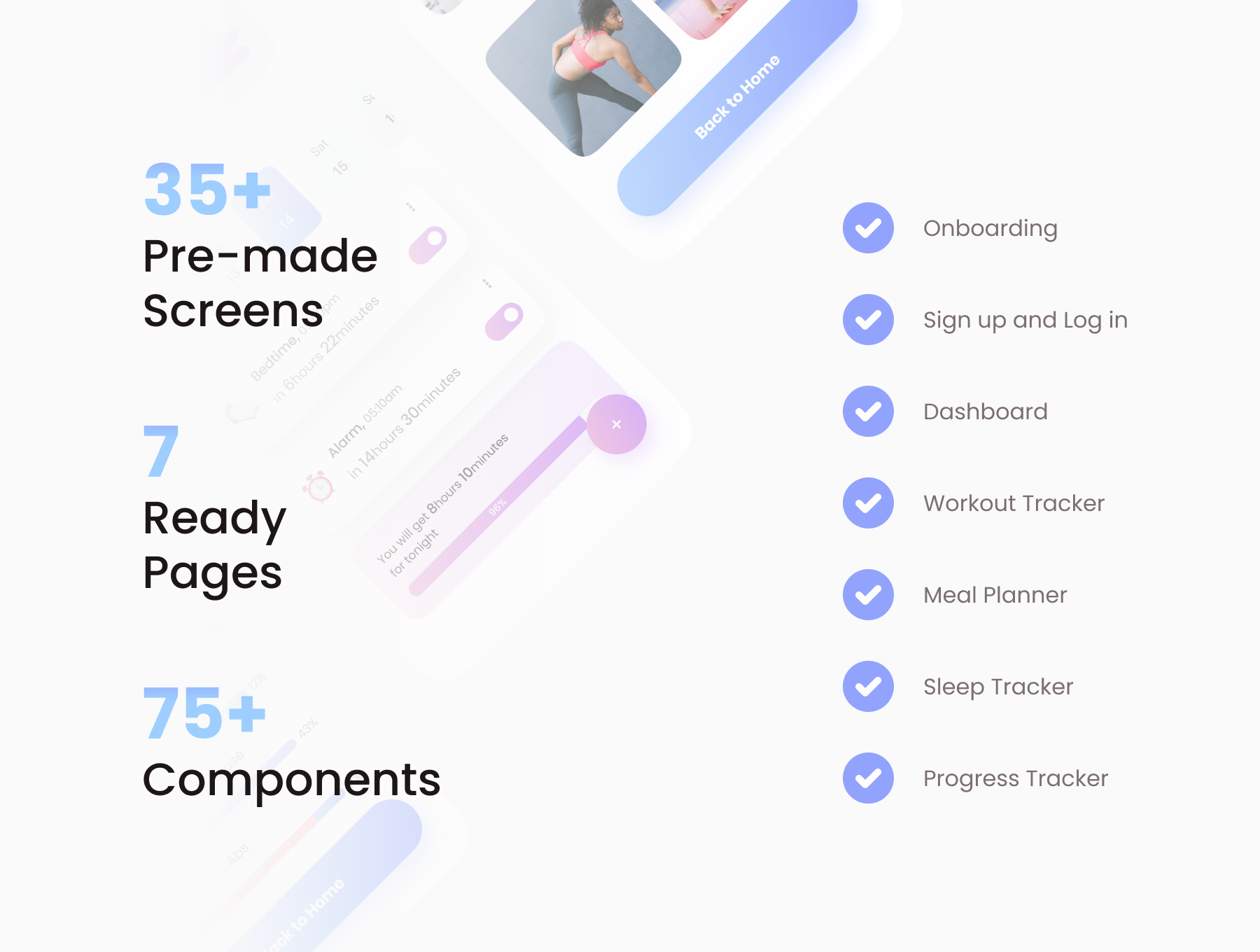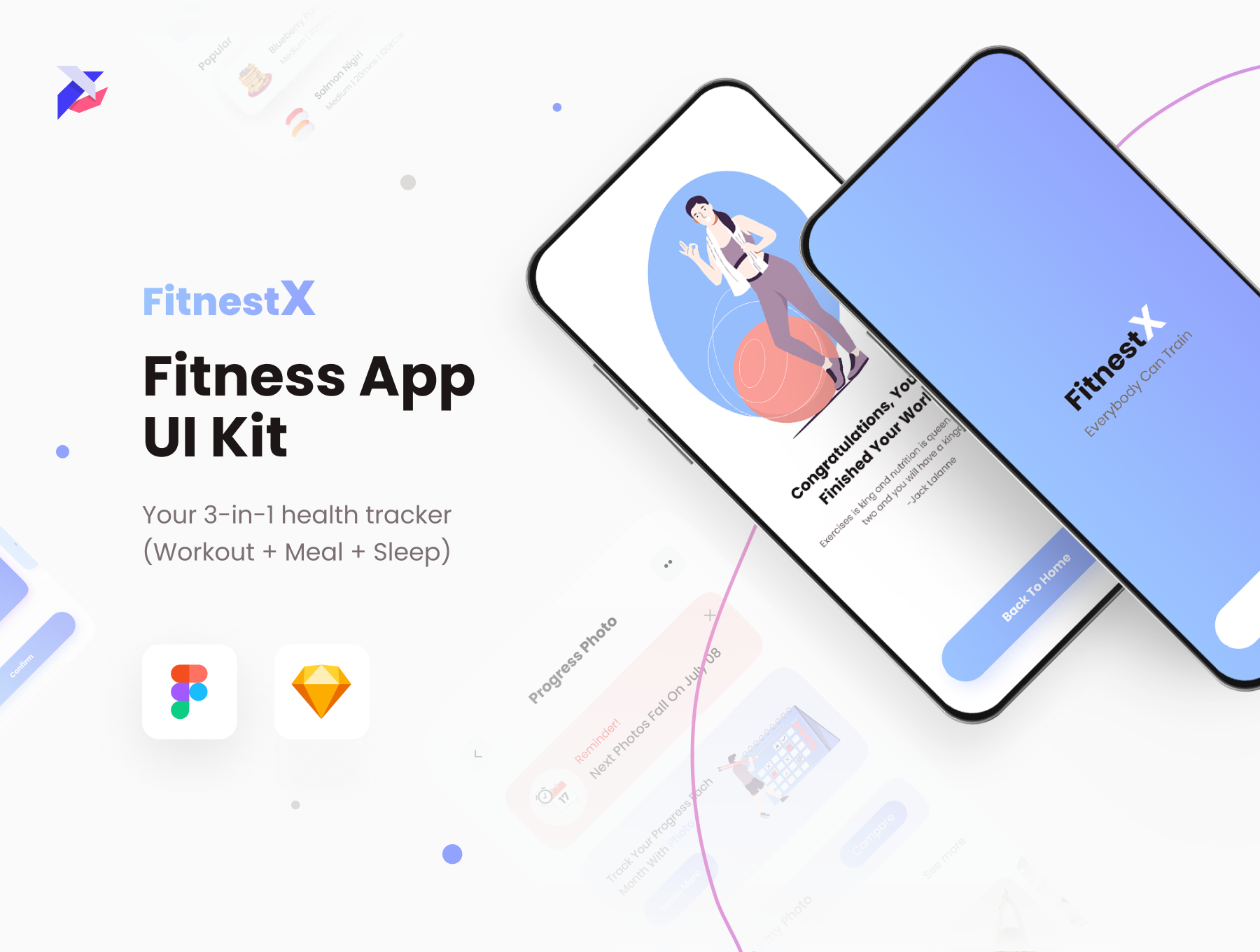 FitnestX is a Fitness App UI Kit thoughtfully created by Pixel True. It's your 3-in-1 fitness tracker. It helps you track your workout, meal, and sleep - making it easy to see your overall progress.